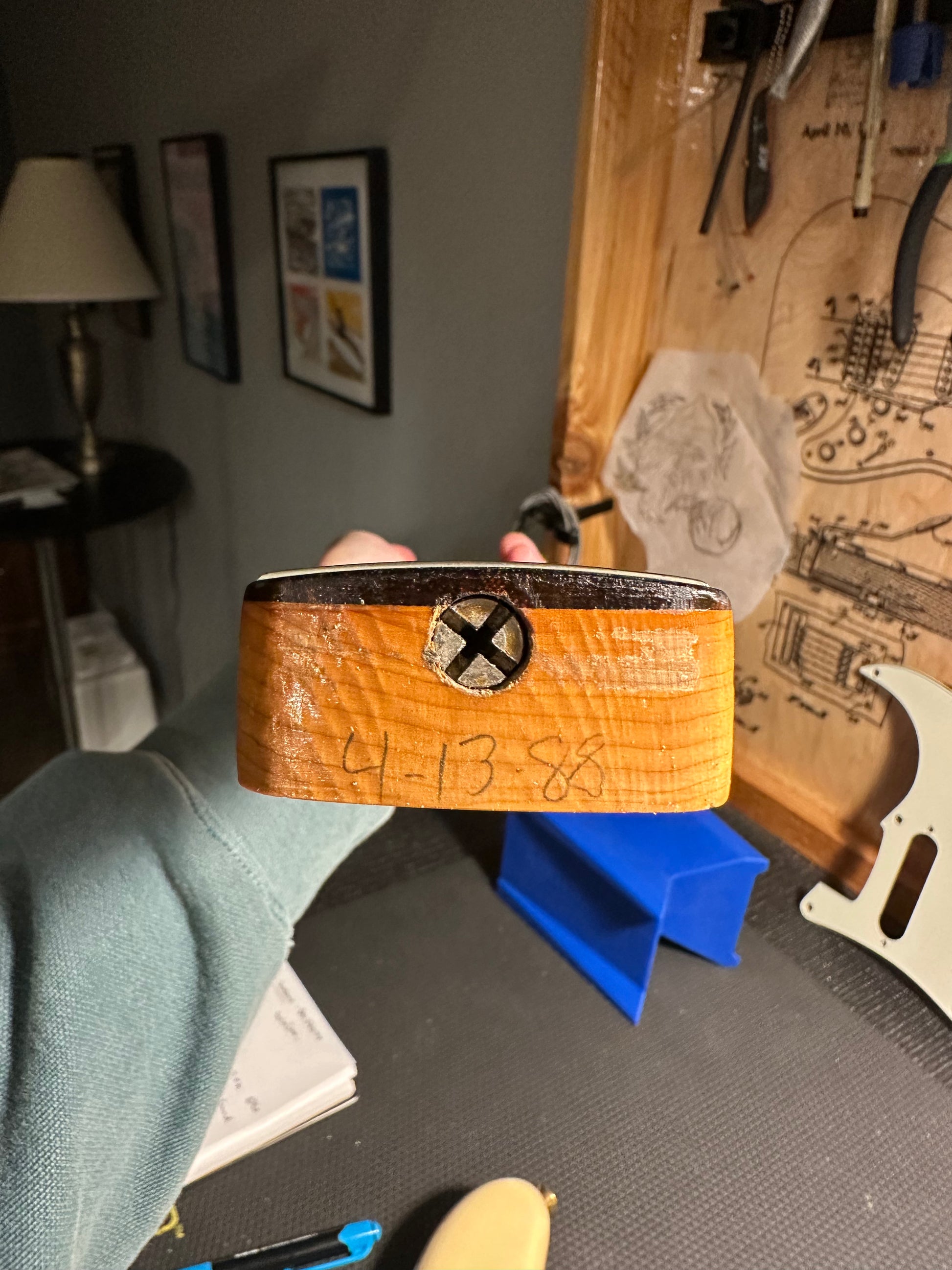 1.6”(41mm) wide at the nut / .85" (21.7mm) deep at first fret, .87" (22mm) deep at twelfth fret. Neck heel is pencil-dated “4-13-88” and has a stamp reading JOHN CRUZ on the bottom of the neck. Neck cavity is stamped “H. CUEVAS.” Tremolo Cavity is signed “J. ANDRADE.”
